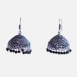 These oxidized silver jhumka earrings feature an intricately detailed dome with floral engravings. Adorned with tiny black beads at the bottom, these earrings blend traditional charm with a modern twist, making them versatile for various occasions.