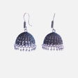 These oxidized silver jhumka earrings showcase a traditional design with intricate floral patterns and tiny hanging silver beads. Their dome-shaped jhumka adds a touch of ethnic charm, making them perfect for pairing with traditional and fusion outfits.