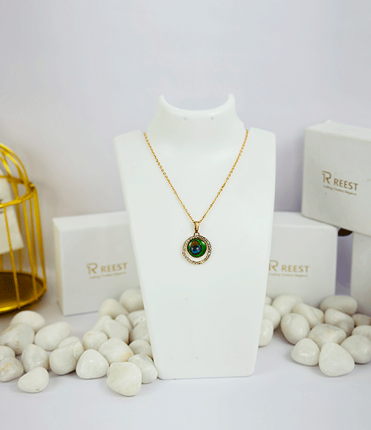 Celebrate the beauty of nature with this exquisite peacock feather Chain Pendant. Featuring a vibrant, circular peacock feather centerpiece encased in a dazzling crystal-studded frame, this piece adds a touch of elegance and uniqueness to your collection. The delicate gold-toned chain enhances the pendant's striking design, making it a perfect accessory for any occasion.
