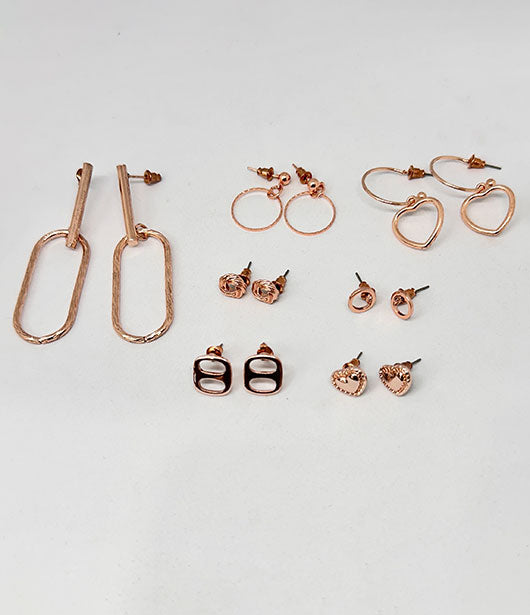 This charming assortment of rose gold earrings is perfect for daily wear or for mixing and matching to suit various styles. Featuring a collection of designs, from modern geometric shapes to delicate hearts and minimalistic hoops, this set offers versatility and elegance for any occasion.