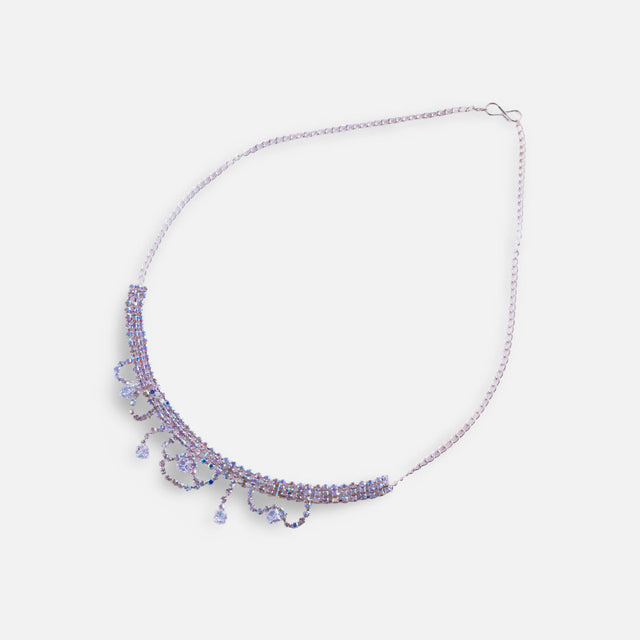 - Design: A sleek silver-tone necklace with crystal embellishments and dangling accents, paired with matching earrings.