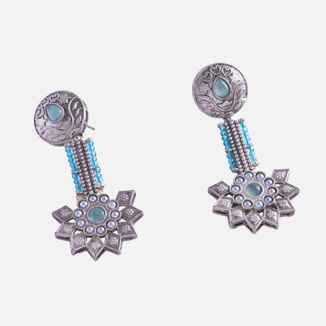 Product Overview: These silver floral drop earrings are an elegant blend of intricate design and traditional craftsmanship. The floral motif is enhanced with delicate beadwork, featuring light blue accents for a pop of color. These earrings are perfect for those seeking a unique statement piece that bridges traditional and modern aesthetics.