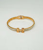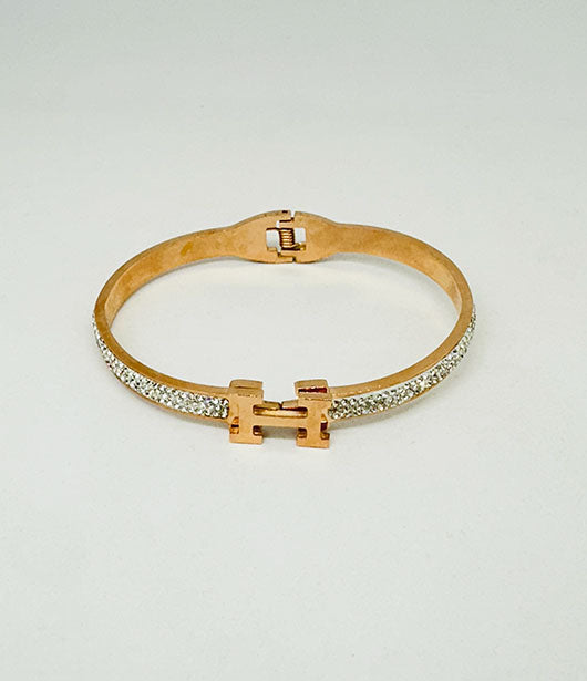 This luxurious stainless steel bangle is encrusted with shimmering crystals along both sides of its iconic "H" centerpiece. The sparkling crystals combined with the polished gold-tone finish create an elegant and eye-catching accessory perfect for adding a touch of glamour.