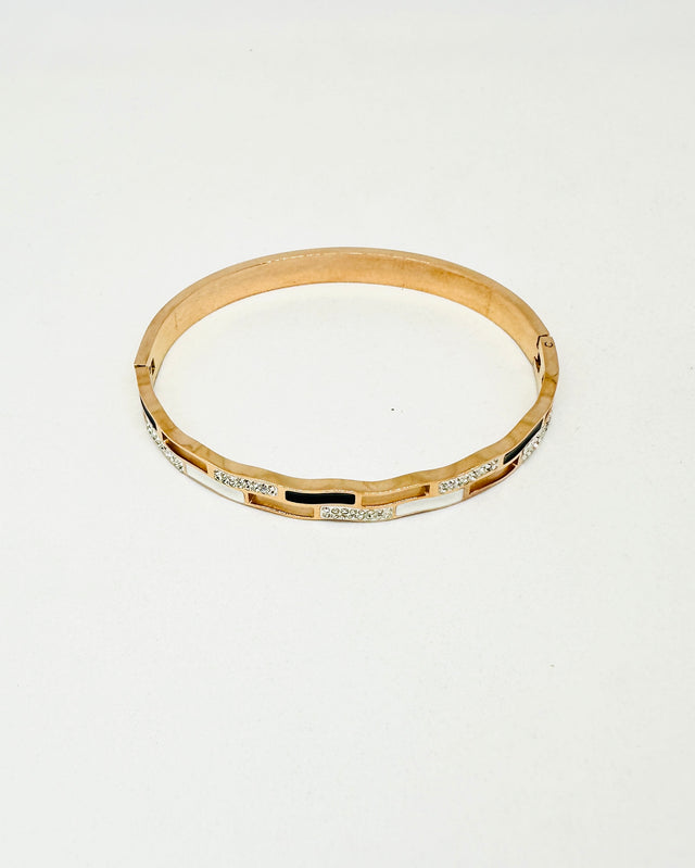 This sophisticated stainless steel bangle showcases a wavy design adorned with black and white enamel sections, interspersed with sparkling crystals. The combination of gold-tone, enamel, and crystals makes it a versatile piece, perfect for both elegant and casual outfits.