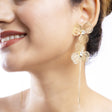 These stunning gold statement earrings feature two intricately designed floral elements, each adorned with a delicate crystal at the center. The long, elegant chain drapes gracefully, adding a touch of glamour to these floral-inspired earrings. These earrings are perfect for making a bold fashion statement.