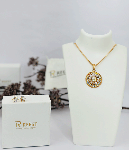 Radiate elegance with this exquisite Chain Pendant set. Featuring a gold-toned chain paired with a round pendant adorned with shimmering pearls and crystals, this set is the epitome of sophistication. Complete with matching stud earrings, it’s perfect for both formal and festive occasions.