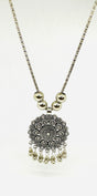 Embrace traditional charm with this intricately crafted oxidised silver necklace. Featuring a bold pendant adorned with floral motifs and delicate dangling beads, this piece blends elegance with cultural appeal.