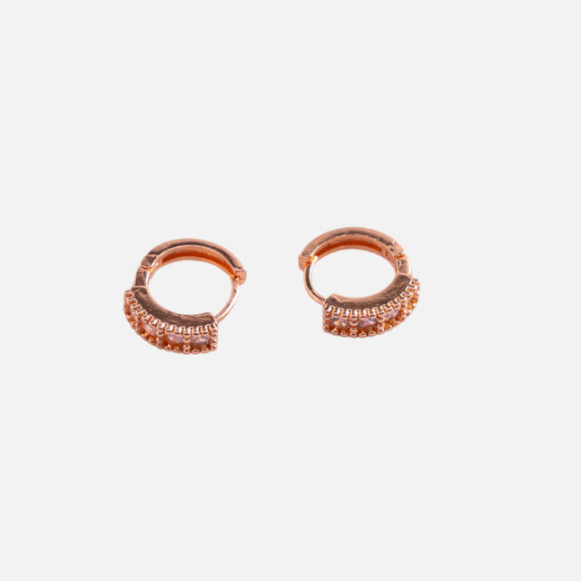 The huggie hoops are designed with a smooth rose gold-tone surface and intricate bead-like detailing across the front, making them versatile for everyday wear or special occasions. Their small size ensures a comfortable fit, while the detailing adds a touch of sparkle.