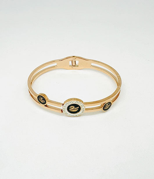 Product Overview: This chic  bracelet features a swan motif set against a sleek gold-tone band. The central swan design is surrounded by sparkling crystals, giving the piece a refined and luxurious look. Perfect for adding a sophisticated touch to any outfit.