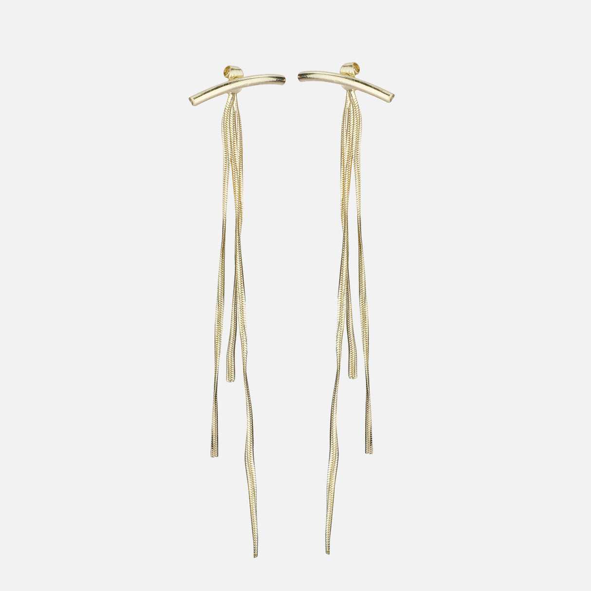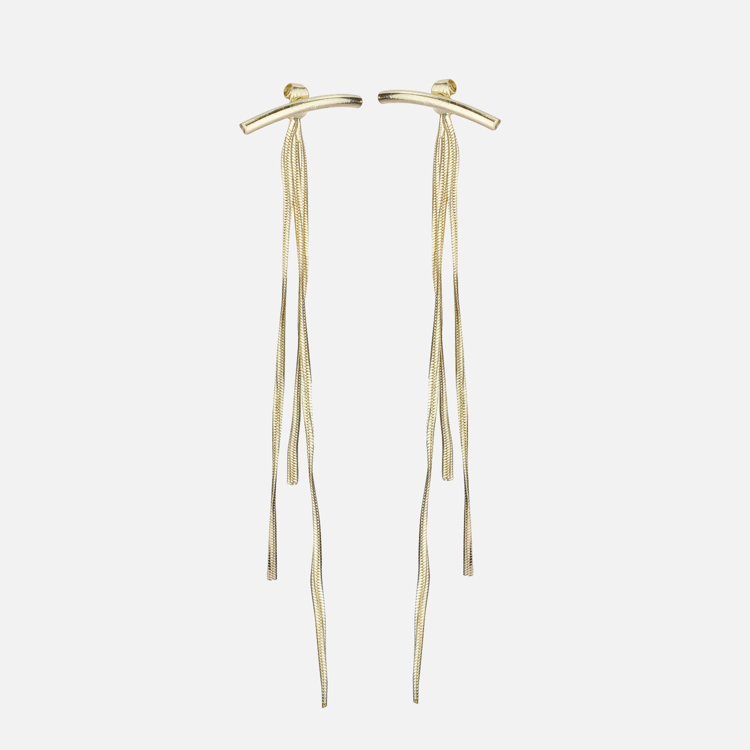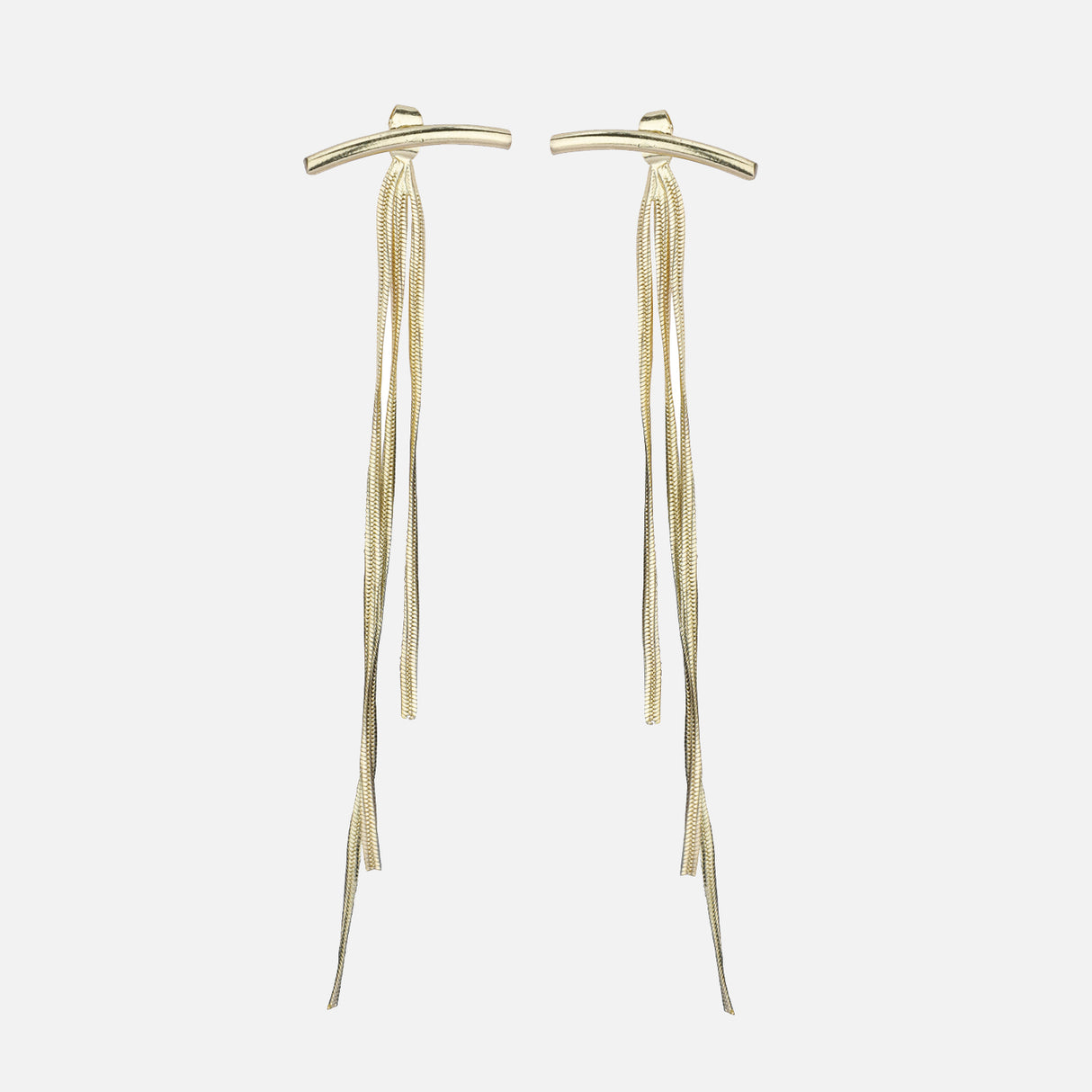 Product Overview: These statement tassel earrings feature a sleek, modern design with elongated gold-tone chains that gracefully sway with every movement. The minimalist top bar adds a sophisticated touch, making these earrings perfect for adding elegance and drama to any outfit.