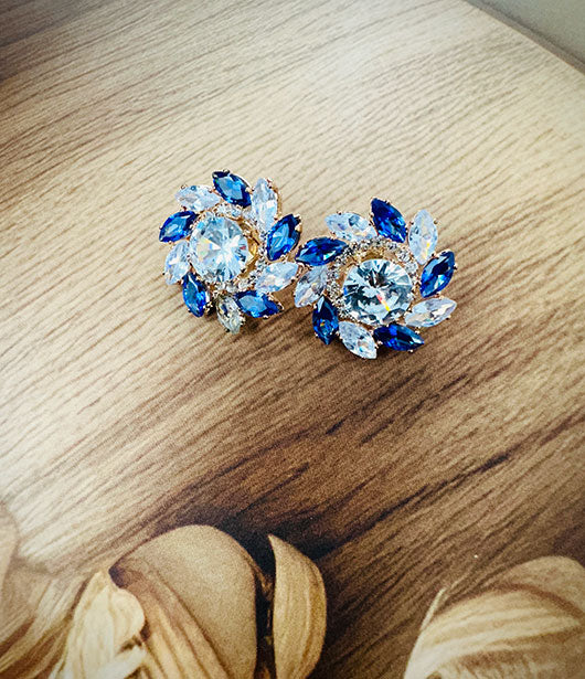 These earrings are the embodiment of elegance and style, combining rich blue tones with clear crystals that catch the light beautifully. They’re perfect for adding a touch of luxury to any look, whether it’s a formal occasion or a glamorous evening out.