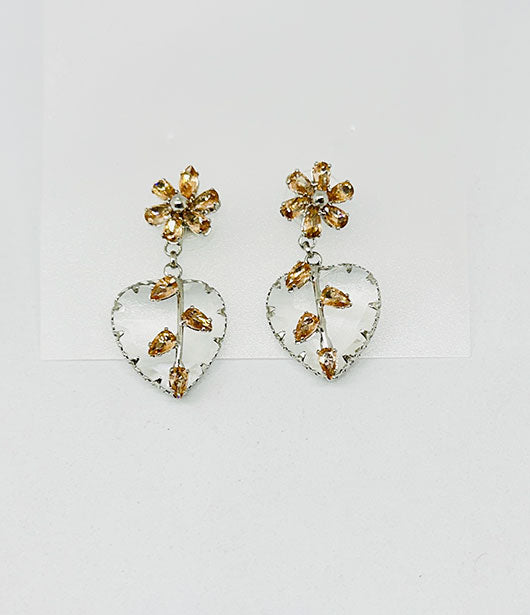 These earrings combine a romantic heart-shaped design with floral and botanical elements, featuring a clear heart frame with golden crystals. The floral accent at the top adds a charming touch, while delicate crystal embellishments along the heart shape bring a soft sparkle, making these earrings a lovely addition to any outfit.