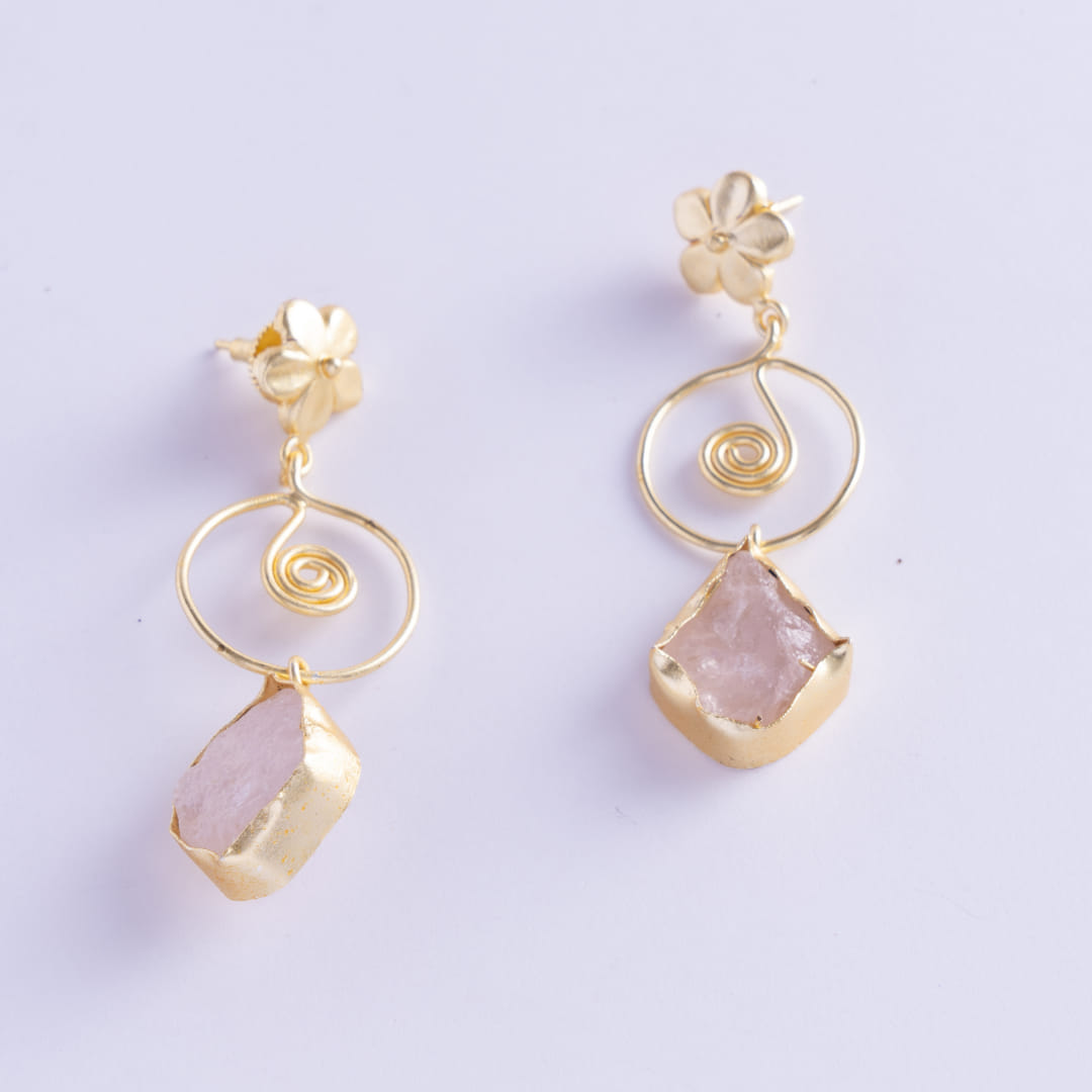 Product Overview: These enchanting drop earrings combine delicate floral accents with artistic spirals, culminating in a clear, natural stone. The floral stud adds a feminine touch, while the circular spiral and raw-cut stone create a modern, bohemian flair. These earrings are perfect for those who appreciate a blend of natural elements with a contemporary design.