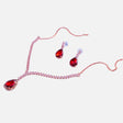 The necklace features a delicate chain adorned with shimmering accents, leading to a striking red teardrop pendant. The matching earrings echo the same teardrop shape, creating a cohesive and elegant set. The deep red hue adds a bold and luxurious feel to the overall look. -