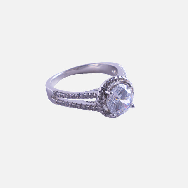 A beautifully crafted halo-style ring featuring a radiant American diamond at its center, surrounded by a delicate pave of shimmering stones. This piece, made from premium brass, exudes timeless elegance and sophisticated charm.