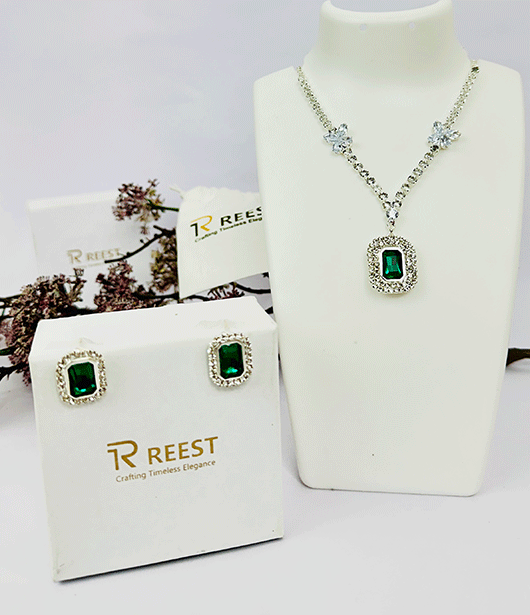 The Regal Elegance Set features a stunning emerald-cut centerpiece surrounded by sparkling crystals. This sophisticated design is complemented by matching stud earrings, creating a set that's perfect for formal occasions and celebrations.